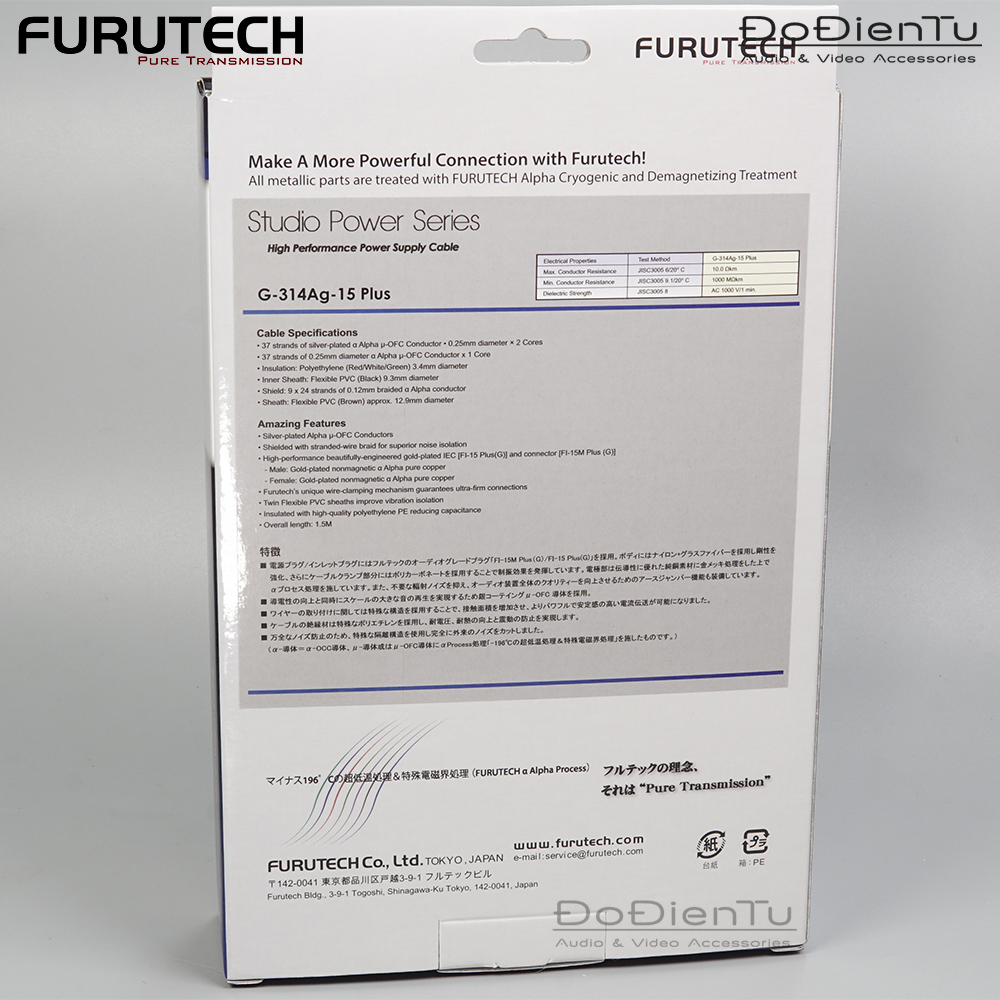 Dây nguồn cắt mét FP-314 Ag II, (FP là viết tắt của Furutech Power) đã được thiết kế cẩn thận đến từng chi tiết. Nguyên liệu làm dây 314 Ag II được xử lý theo quy trình Alpha (α Process) của Furutech: Ngâm bể lạnh âm 250 độ C và chống nhiễm từ, đảm bảo tiêu chí “Dẫn truyền tinh diệu” (Pure Transmission) của hãng.